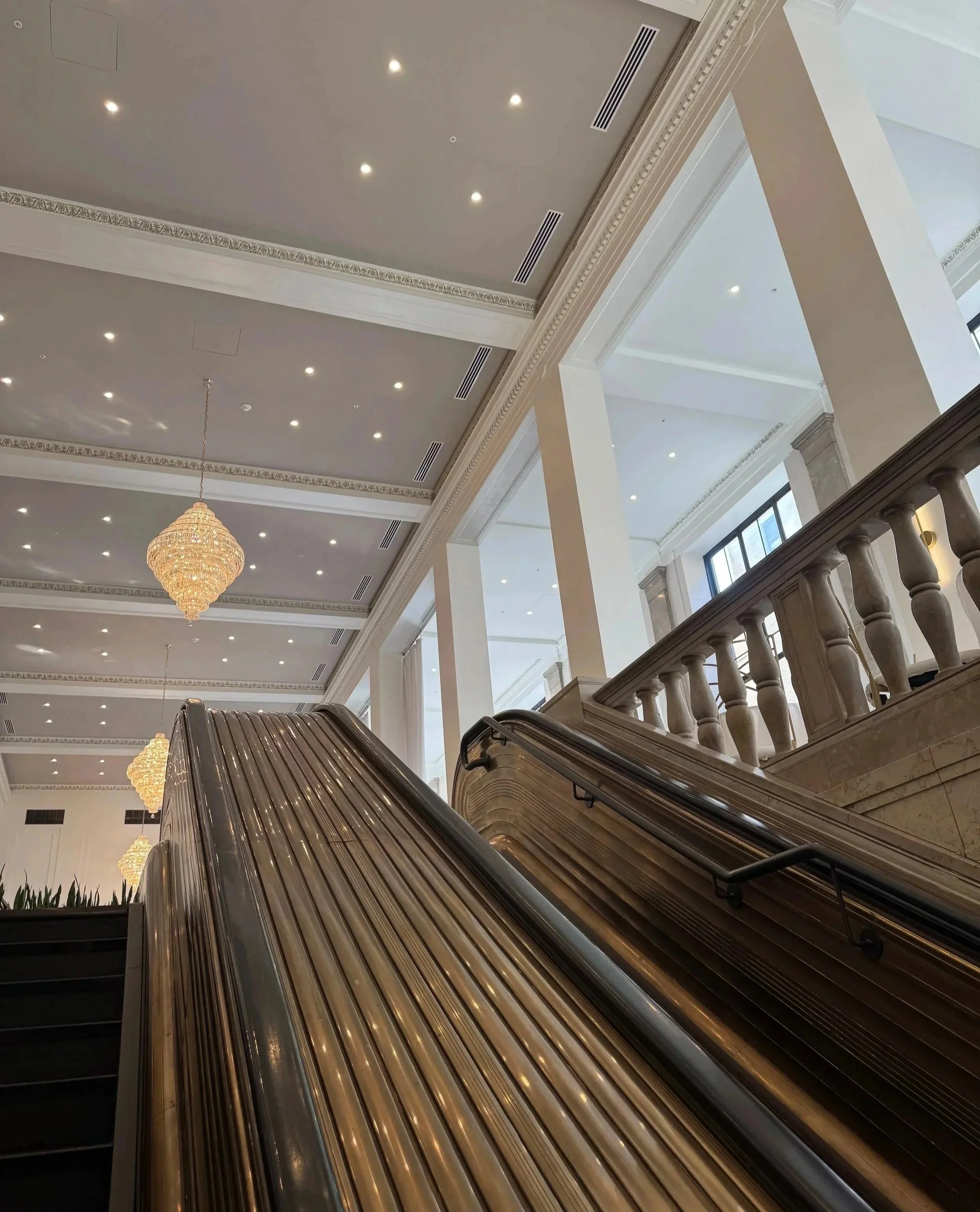 Located in the heart of downtown Rochester, Arbor Midtown reimagines the grand ballroom of the historic Lincoln Alliance Bank. Many of the building’s original 1926 details remain, including natural travertine flooring, marble-clad columns, hand-sculpted wall friezes, and floor-to-ceiling windows, all carefully preserved through a meticulous restoration. Once abandoned for years, the ballroom was thoughtfully transformed with a brighter, more refined aesthetic, while the grand staircase, made from the second escalator ever built in Rochester, remains one of the venue’s most distinctive historic details. When you arrive at the top of the grand staircase, this historic bank turned luxury event space has crystal chandeliers, art-deco tiling, and brass details throughout.